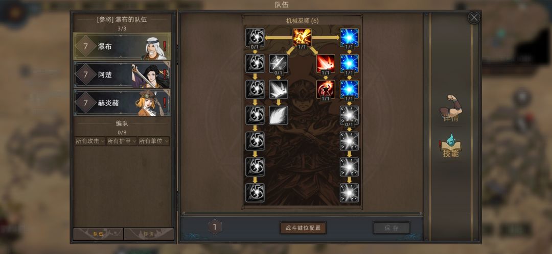技能先开流火召唤,装备记得装上铁人之臂。然后就可以爽快开局了。等到可以再升级其它技能后(如图4所选择技能),就基本无人能挡,7级就随便攻城不在话下,不需要带兵,万一招募了也把兵解散,以获得更多经验收益。