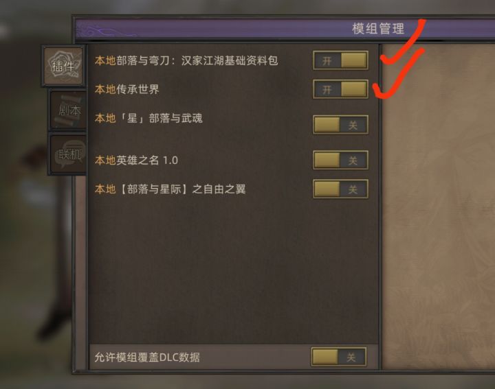 第一步、开启基础资料包+传承世界两个mod
