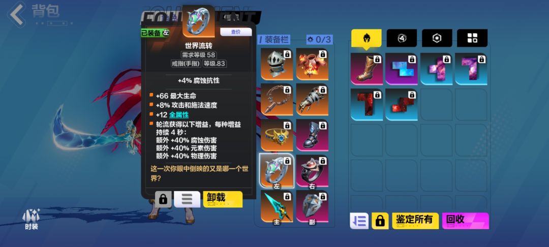2.世界流转是不需要的,我带它是因为懒得再打造一个戒指了,其实打造的戒指效果比它更好,我的抗性也没满,大家可以在戒指上补抗性;