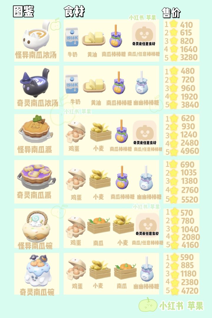 心动小镇奇灵夜季食物图鉴,其中奇灵南瓜汤奇灵南瓜派奇灵南瓜碗,需要在怪奇系列食谱上将食材进行替换。