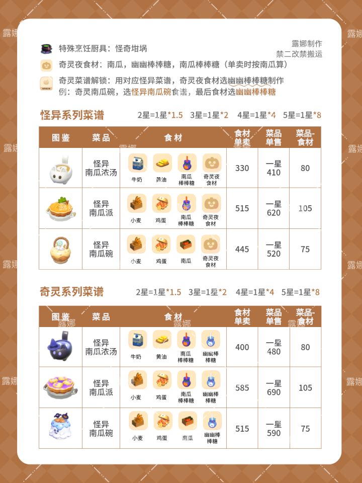 心动小镇 奇灵夜新菜谱 食材表+售价+成本