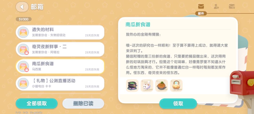 3.烹饪10次流行料理。(先在邮箱领取料理罐子和食谱,将罐子摆出来,学习了食谱,就可以进行料理了,没种小麦的不要选那个来烹饪)
