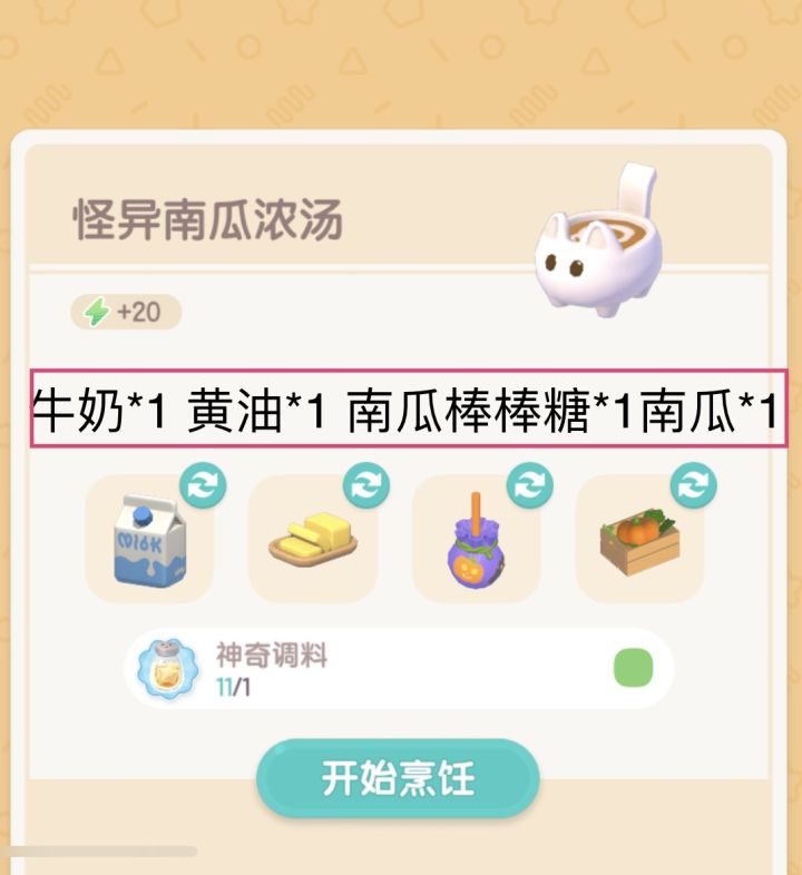 而奇灵南瓜浓汤、奇灵南瓜派、奇灵南瓜碗这几个需要在做出原有食物后更高一些配方得到新的特殊奇灵食谱