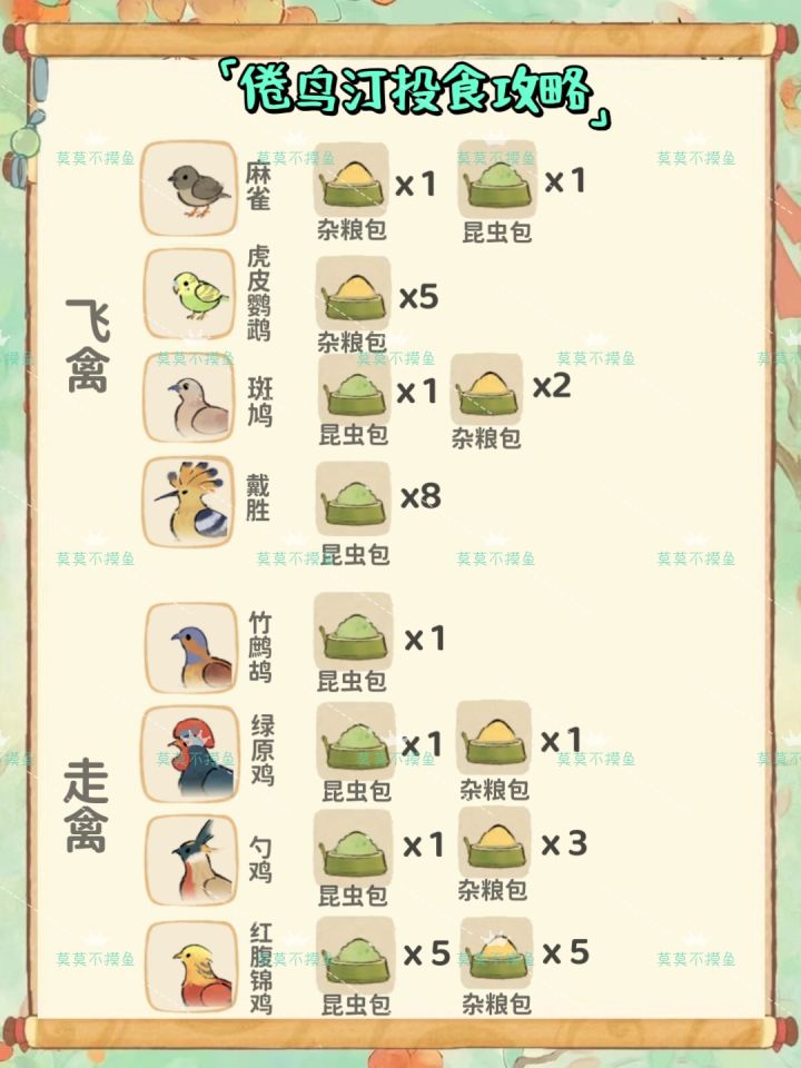 注意每只鸟喜欢的食物不一样,根据图片投放对应鸟粮和数量比例。