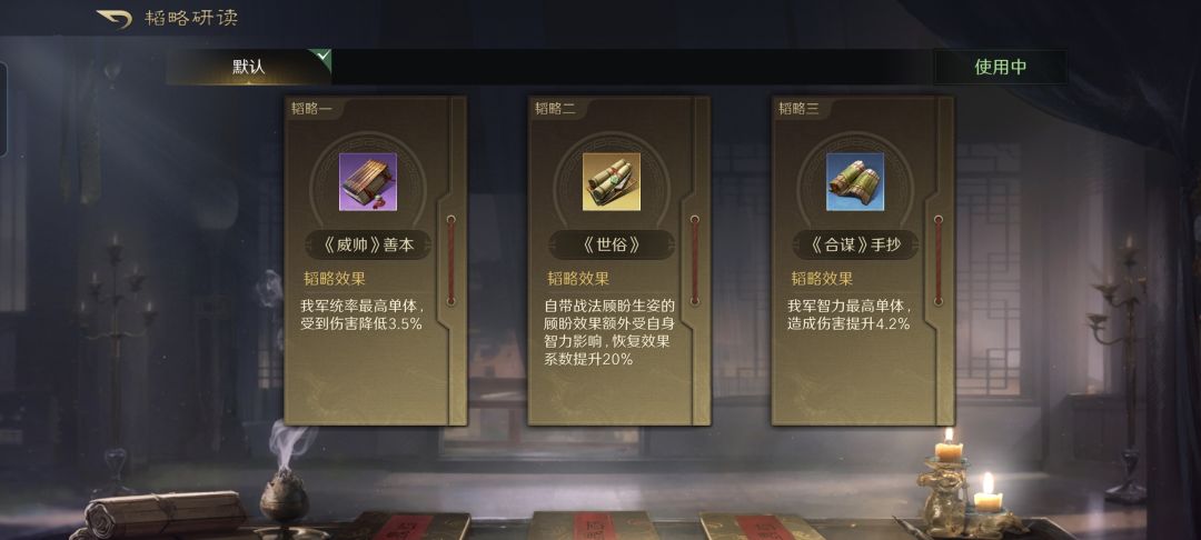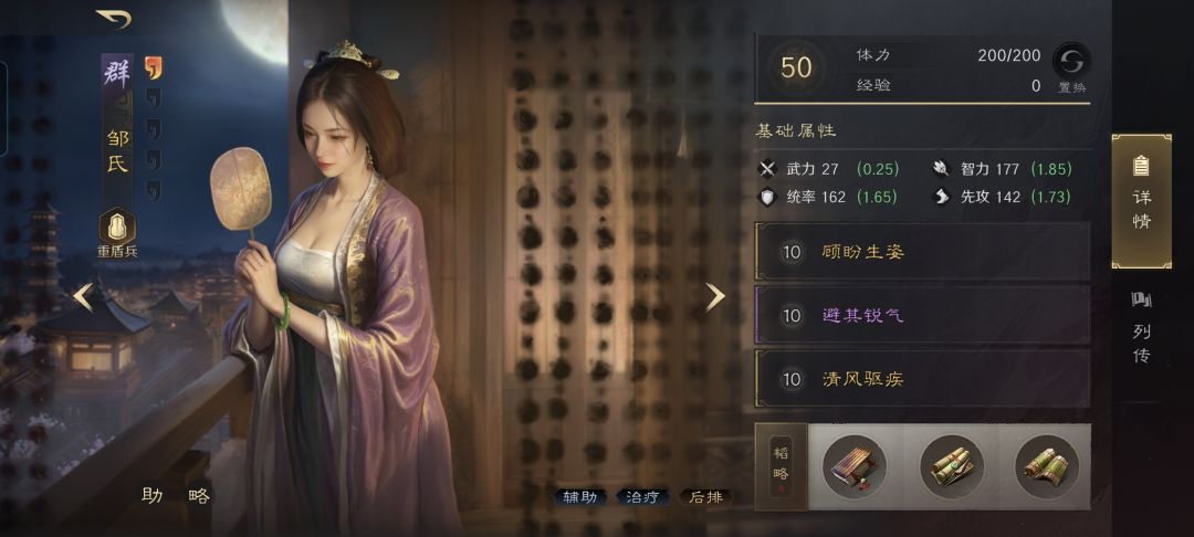 箕形阵后排的邹婶娘和司马懿,一个负责左右打辅助,一个负责火力全开。邹婶娘研读的兵书很有意思,既照顾到了给全队最高统率值的皇甫嵩进一步减伤,又给全队智力值最高的司马懿进一步增伤。