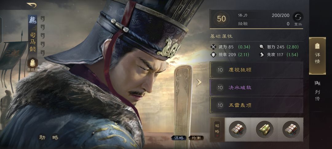 司马懿战法:鹰视狼顾+决水破敌+五雷轰顶。