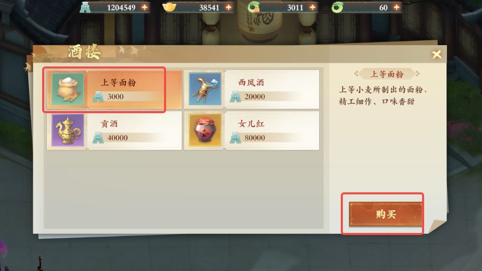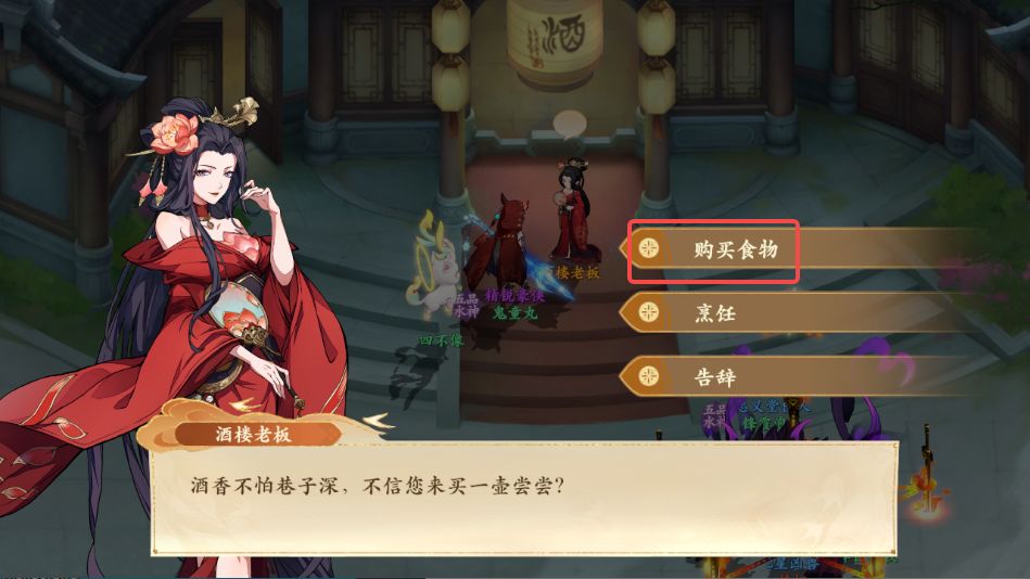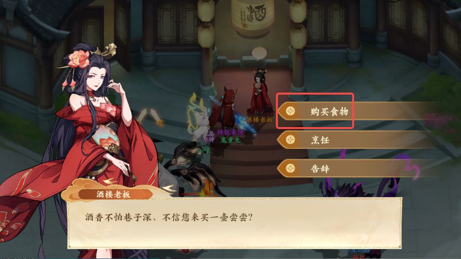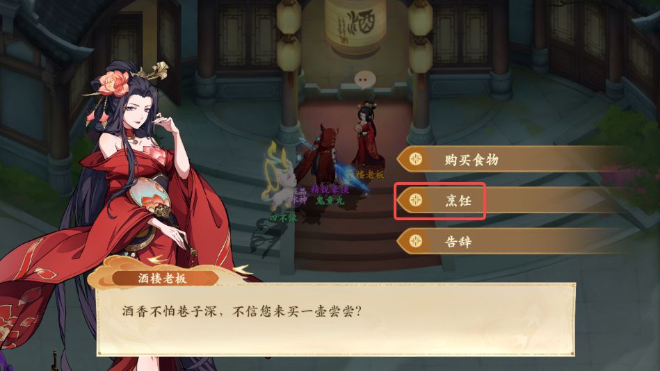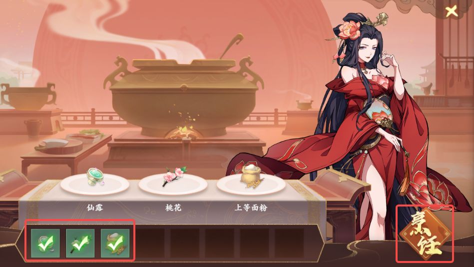 5、购买后再次与酒楼老板对话,选择烹饪,放入仙露、桃花、上等面粉后点击烹饪即可获得仙香糕