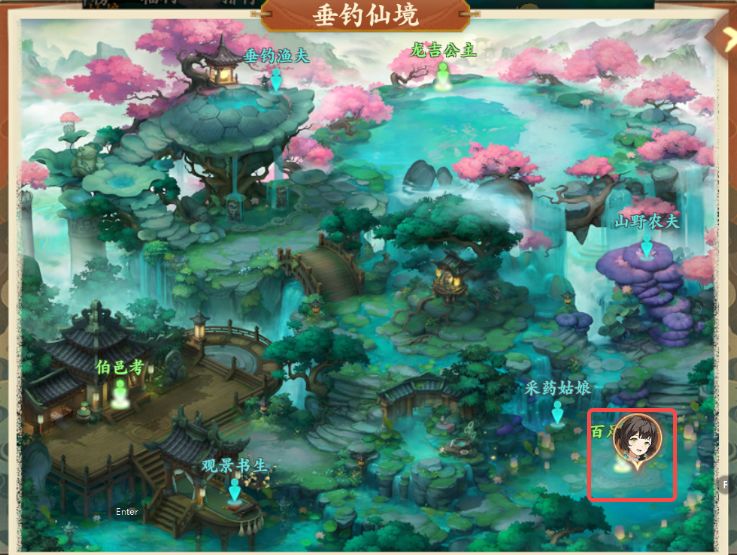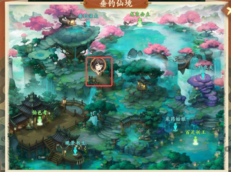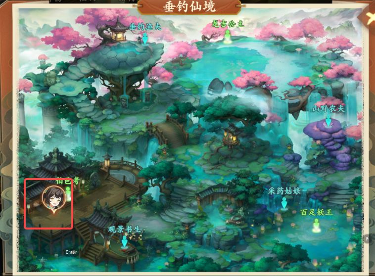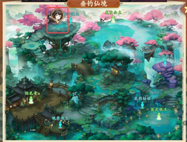 4、对话结束后前往垂钓仙境如图所示处与云游画师对话,对话后获得双剑临摹图