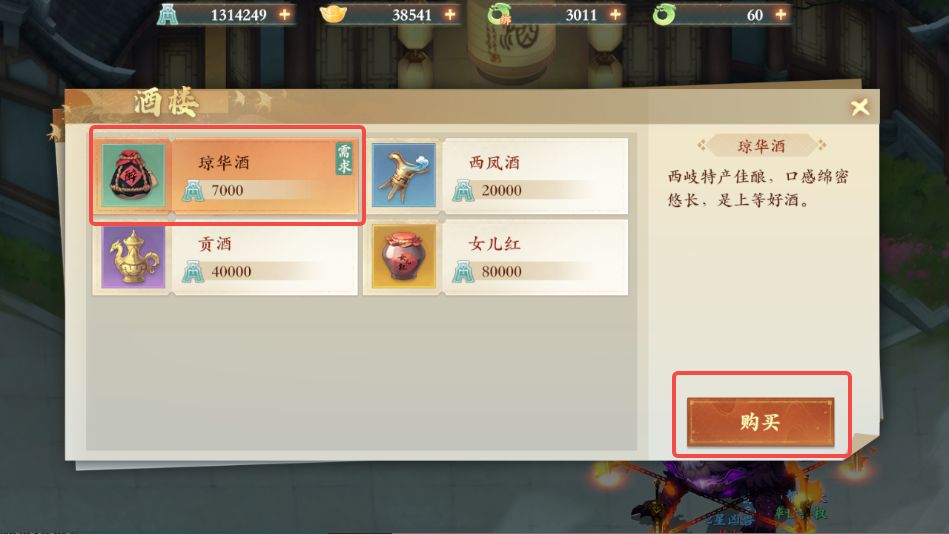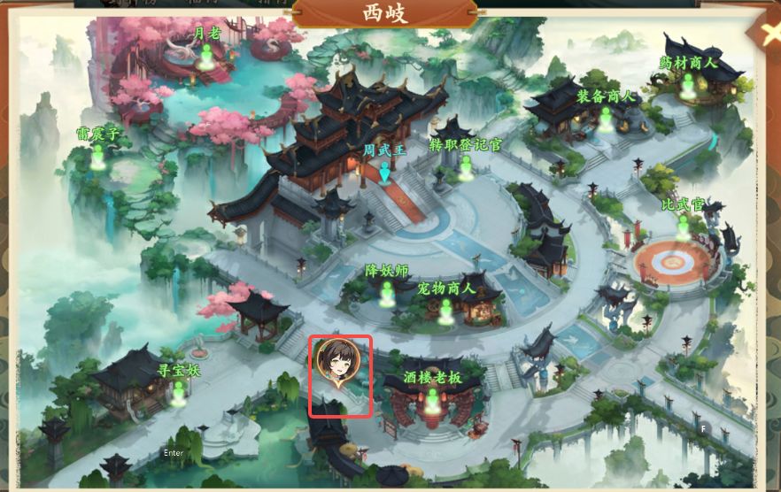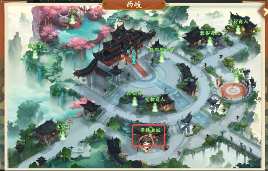 4、对话结束后前往西岐如图所示位置,向酒楼老板购买琼华酒