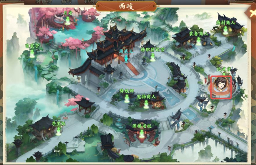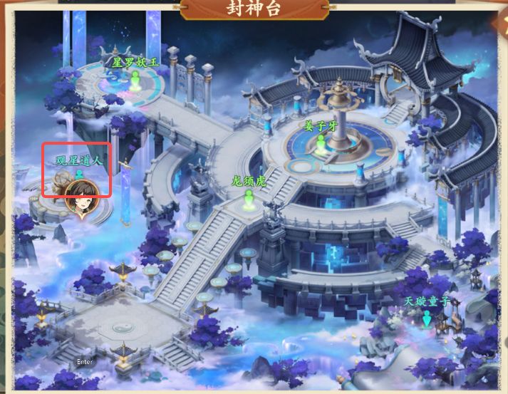 3、打开地图前往封神台如图所示处与观星道人对话