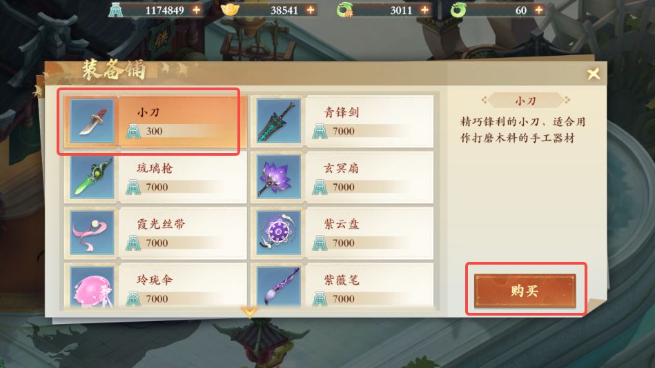 2、拾取木枝后前往西岐装备商人处,与其对话选择购买装备,购买一把小刀