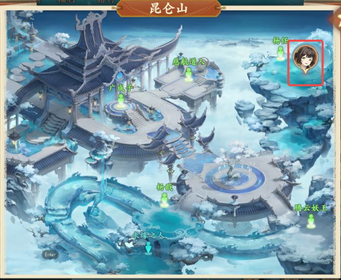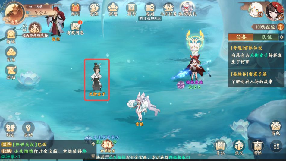3、购买完成后前往昆仑山如图所示地点与天衡童子对话,获得昆仑山仙果