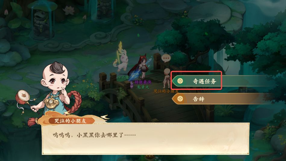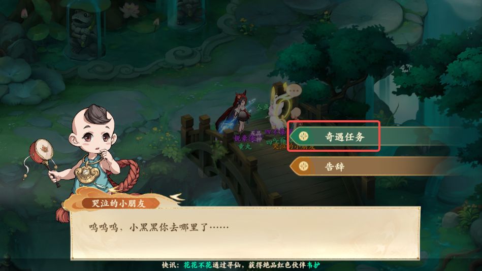 1、前往垂钓仙境如图所示位置的桥上与哭泣的小朋友对话,领取奇遇任务