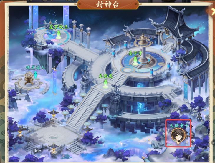 2、领取任务后前往封神台如图所示处与天璇童子对话后获得仙露