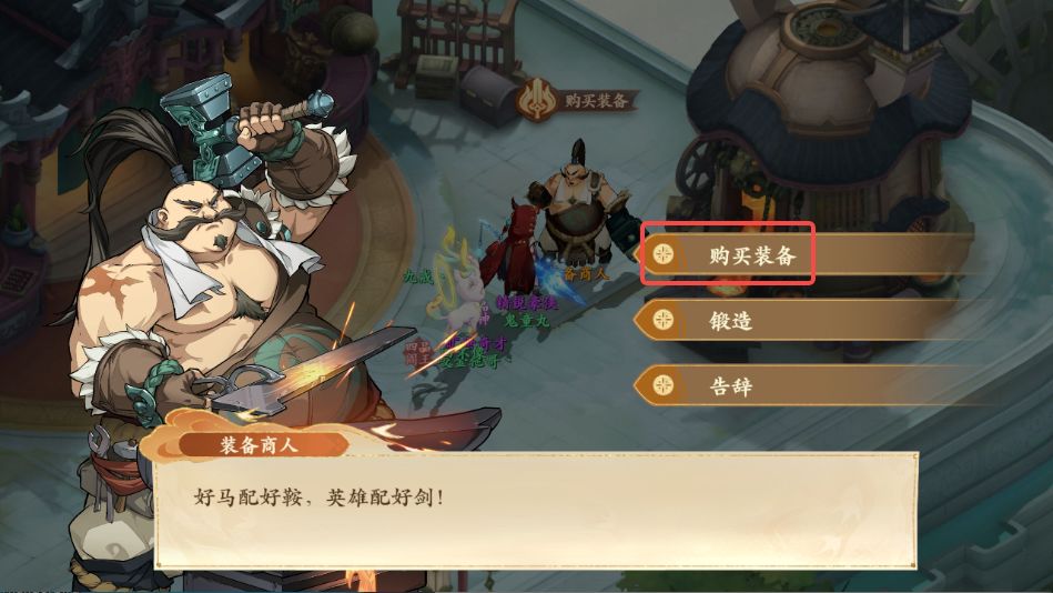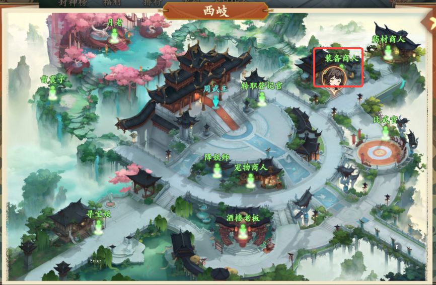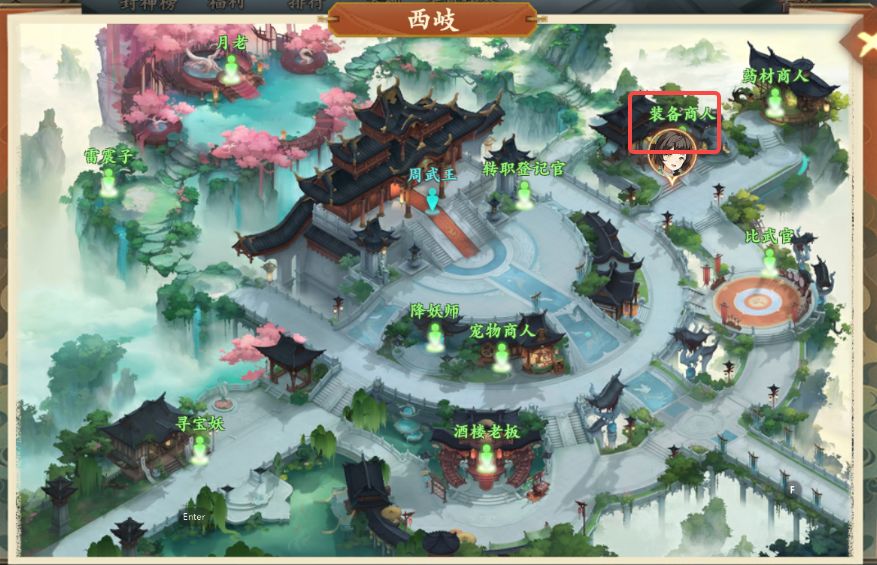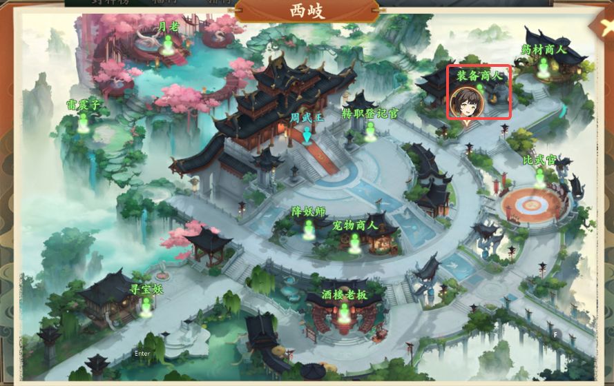 2、对话结束后前往西岐如图所示装备商人处购买捕兽夹