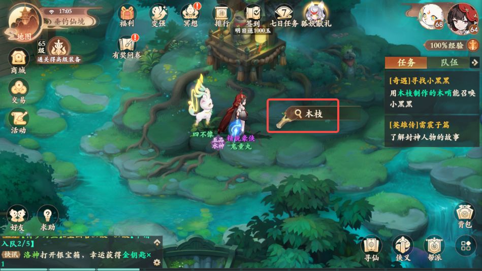 23、寻找小黑黑:垂钓仙境中间桥上哭泣的⼩朋友对话-往右下⾛在树下拾取木枝-西岐NPC装备商人购买小刀-再次对话装备商人锻造获取木哨-垂钓仙境采药姑娘右方楼梯拾取狗⽑-往下走触发交付木哨-回到中间桥上哭泣的⼩朋友对话