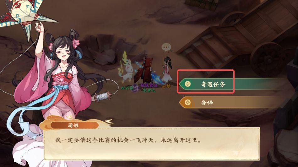 1、前往牧野战场如图所示处与厨娘对话,获得传家菜谱,领取奇遇任务