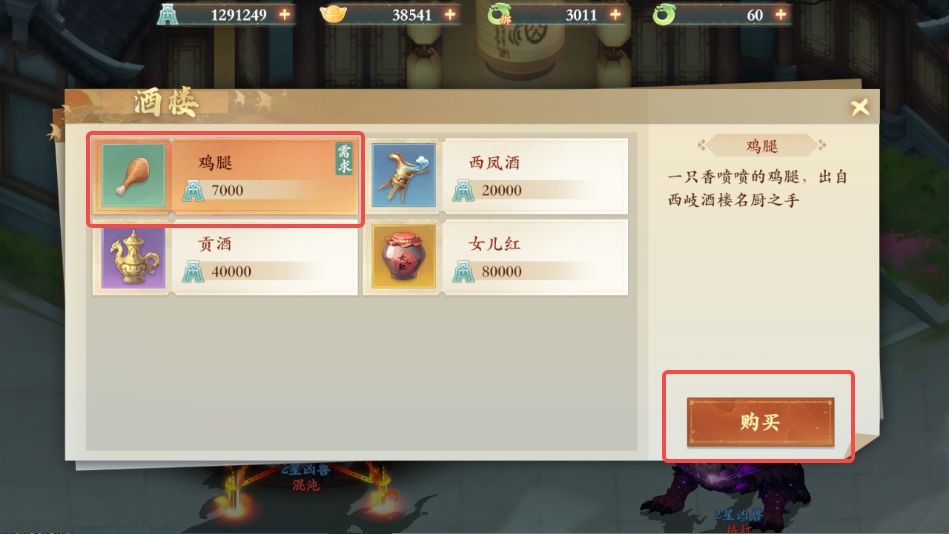 6、对话结束后前往西岐酒楼老板处与老板对话,选择购买食物,购买鸡腿