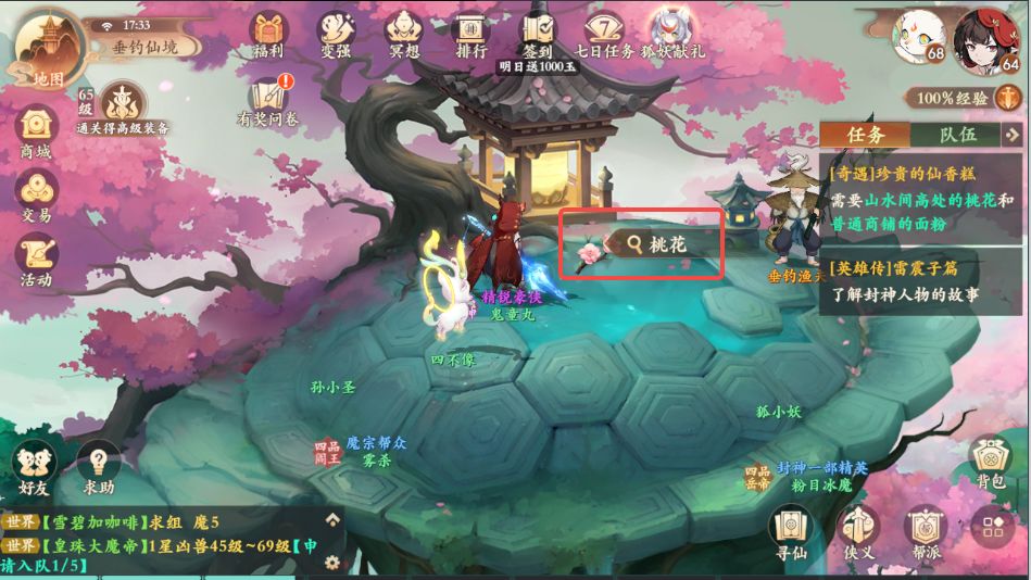3、之后前往垂钓仙境如图所示处,拾取地上的桃花