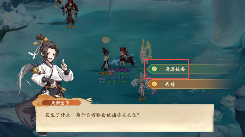 28、雪狐传说:朝歌NPC祈福之人旁边雕像背后朝歌书生对话-西岐NPC装备商人买捕兽夹-昆仑⼭NPC⼴成⼦台阶下右侧的天衡童⼦对话-昆仑⼭NPC杨任右方使⽤捕兽夹(未触发来回走动下)-昆仑⼭NPC杨任下方衡童子对话-回朝歌找朝歌书生对话29、治病药酒:西岐NPC酒楼老板左边台阶上忧愁的⽼翁对话-NPC寻宝妖右上方触发剧情(未触发来回走动下)-回去找忧愁的⽼翁