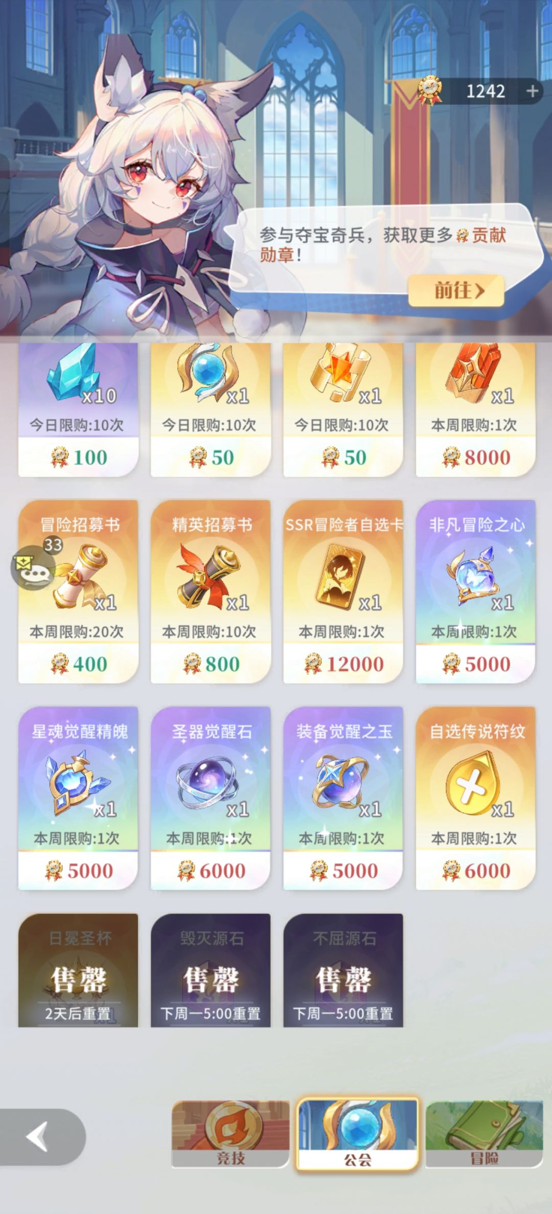 工会币:留着换一个圣器杯子开图鉴,还有两个源石,这个源石也是只能在这里获取很加战力。后面多就是买星魂觉醒石和装备觉醒之玉了。