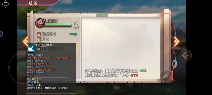 接着再来说董卓这个随从,这个随从要看时局上装备,董卓的被动技能酒池肉林是给我方减伤40%,同样,也是给我方减低输出50%,也就是伤敌50,自损50。