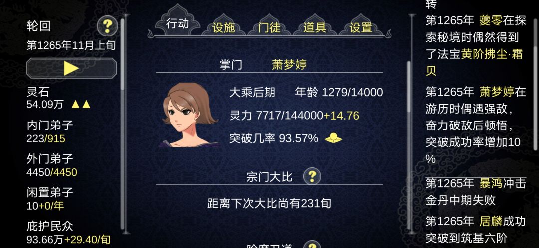 选气运之子,然后无垢,有剩余可以升灵根,和功德池里面渡劫成功率,开局后有徒弟看炼丹效果,有这是重点,没得炼丹效率的给除魔,炼器,灵矿前期不用考虑,气运之子很容易触发给高级法器,我这就是直接在第一次宗门大比前直接触发给玄品法器,第一个徒弟就变异天,后面触发给的法器看效果有增加修炼速度,突破概率,看使用条件使用或留着等新收徒弟,没这两张效果的直接卖掉,到后期炼丹需要灵石太多,买天品都不够练几个丹的,但是适合的法器养成器灵,一个就有可能加50%渡劫成功率,而且是一直有效,,剩余就靠时间肝了