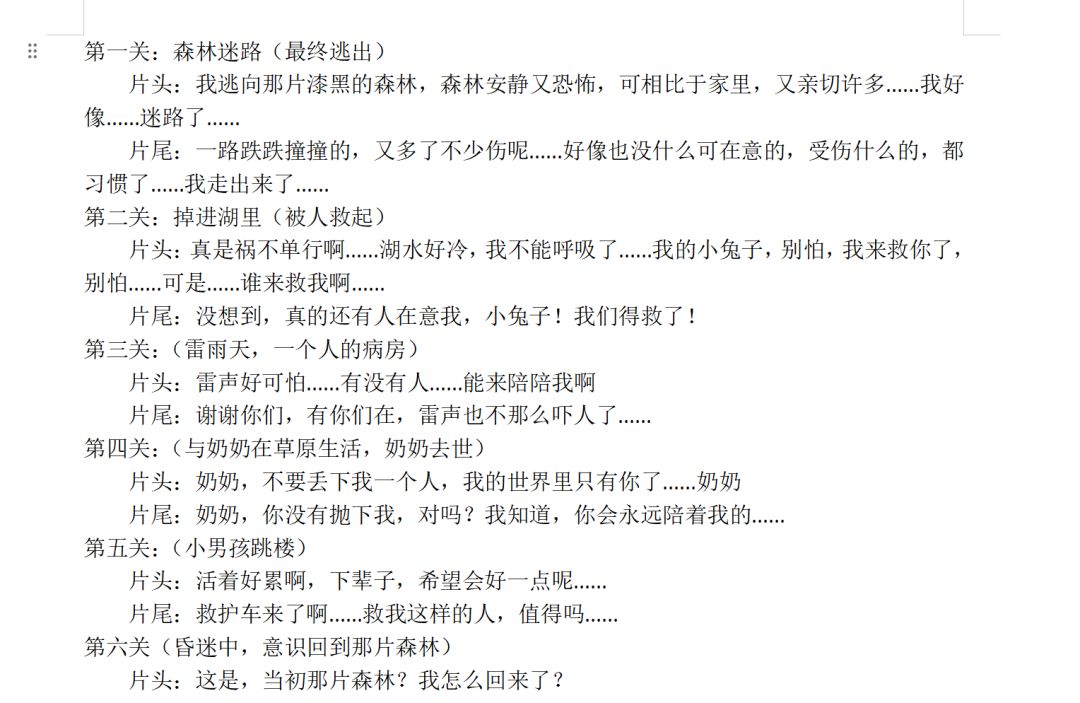 在本策划的反复推敲和斟酌后,终于写完了各个关卡头尾动画的旁白文案,接下来只要找一位“小男孩”配音,即可加到游戏中!首先当然是本策划自行尝试配音,但是,写的时候身临其境、感同身受,给自己都看emo了,然而读的时候却是平平淡淡的甚至有点想笑,完全无法代入......