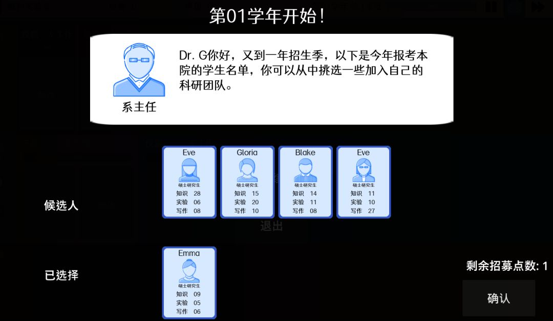 学生的初始能力在一定范围内波动。硕士研究生的能力相比博士研究生会低很多,但相应的,每月需要花费的助研费用也更低。在游戏游戏初期,玩家只能招募少量硕士研究生;随着游戏进行,玩家将能招募能力更强的博士研究生,大大加速科研工作的进行。