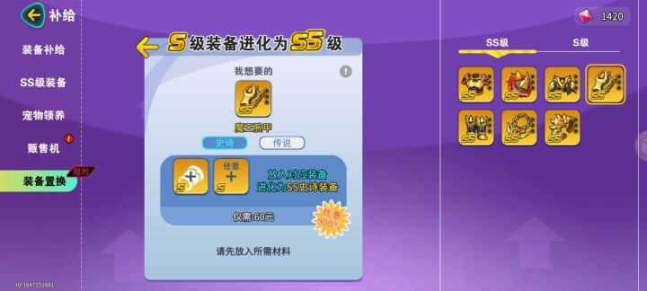重要是这次良心的限时活动,大家可以将s级装备花60块生成ss级,萌新如果你是零氪,攒一周钻石一定能抽到2件s级装备,只需花60元就可以生成ss级,可谓极品装备,唾手可得!
