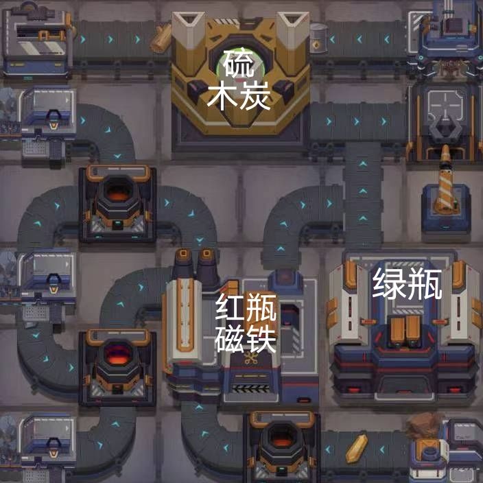 只生产钛块卖钱,生产其他的不划算。可以按图3来摆,专门生产钛块卖钱,17.5小时箱子会满,去市场刷新,钛块单价2000左右就可以卖。图中红色机械臂设定只抓取钛块,这样碎石就不会流到箱子里占地方,在炉子里把碎石也锁定了🔒🔒🔒这样背包收集页面就看不见碎石了,也不会被收集。 图3中建筑和机械臂都是4级,传送带1级。