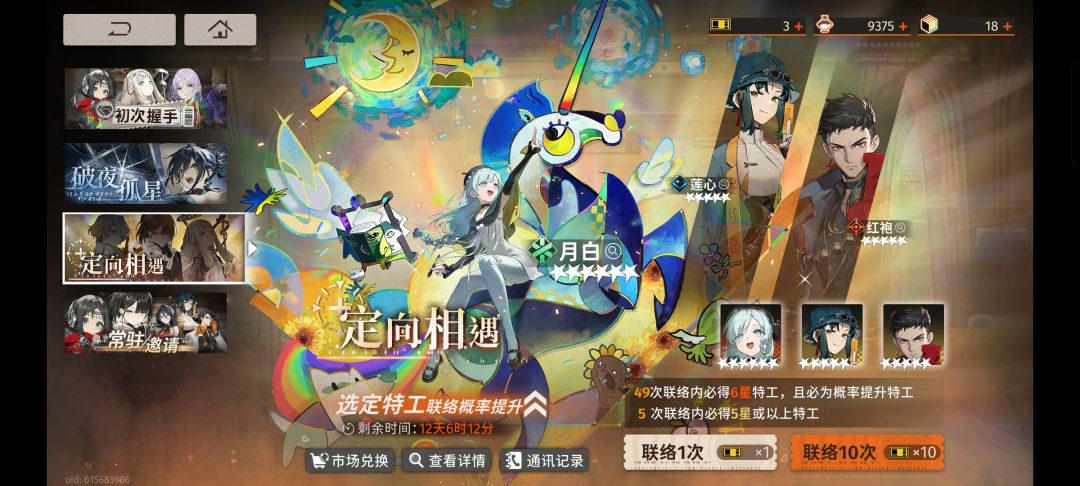 定向卡池:六星角色抽取顺序为月白>净天>碎银子,月白强力充电器,净天特殊伤害的神,碎银子主打持续伤害,五星角色抽取顺序:洞明>天星>启航>朝颜
