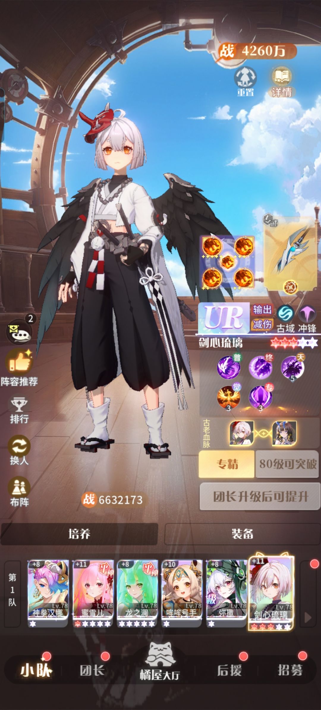 ●此队伍主养剑心,次养雪儿,其次龙女,再次号手汉娜,之后攒资源先养灵珑,有需要再养梦魅。有三星以上弥撒就换掉一队中的神拳或号手。另外楼主自己的零氪古域小号就是走这个配队,放张第42天的截图给大家做个参考吧