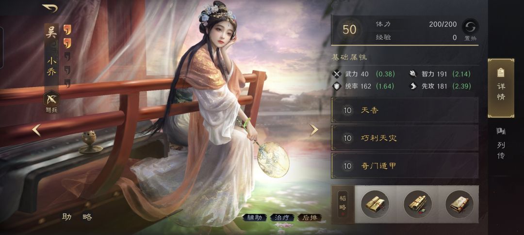 作为铜雀弓里的老牌肉盾,大乔自然还是前排,只不过欺男霸女在阵型上选择了鱼鳞阵,使得大乔在收获了重骑兵坦度的基础上,还额外具备了较高的规避率。
