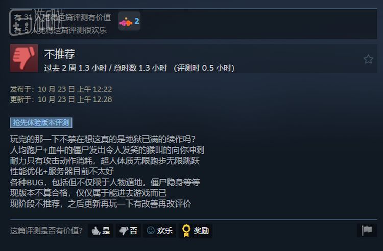 结果《地狱已满2》既无力讨好前作粉丝,也不能把新玩家伺候舒服。目前这个连半成品都算不上的版本满脸死相,“多半差评”不仅败坏了它今后的口碑,想必对开发团队的士气也会造成不小的打击。