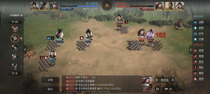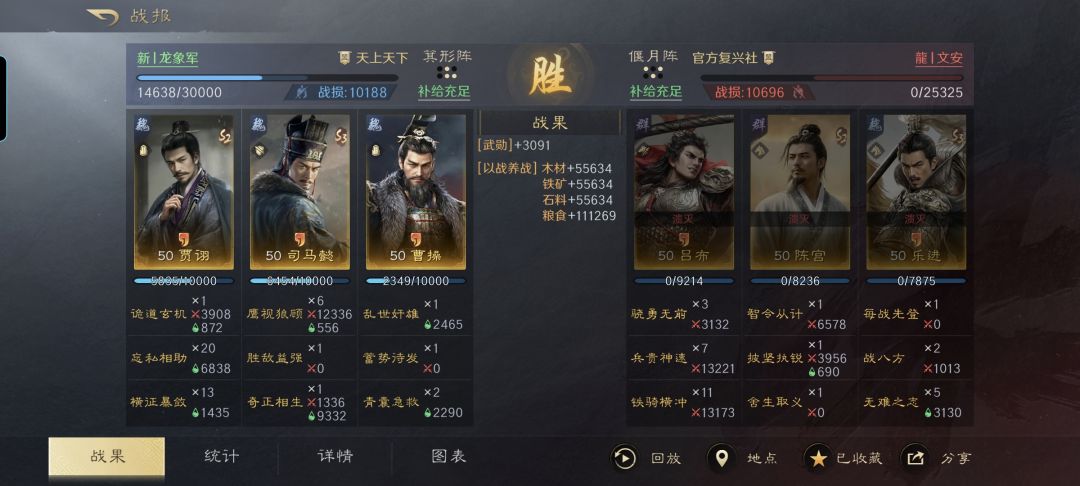 在此特别鸣谢游戏ID名为“新丨龙象军”的玩家朋友,给本文提供了宝贵的创作素材。新丨龙象军利用他麾下的贾诩、司马懿和曹操摆出箕形阵,虽然在速度上完全不可能跟对面的先登吕布相提并论,可他们却凭着厚实到令吕布都绝望的奶量获得了最终的胜利。当中有哪些值得借鉴的亮点,且看下文分解。