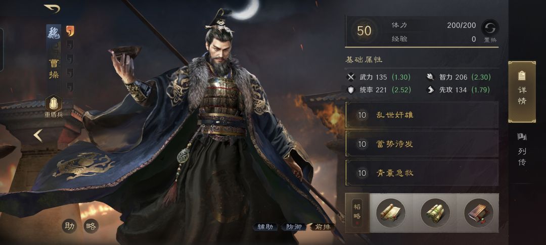 曹操战法:乱世奸雄+蓄势待发+青囊急救。