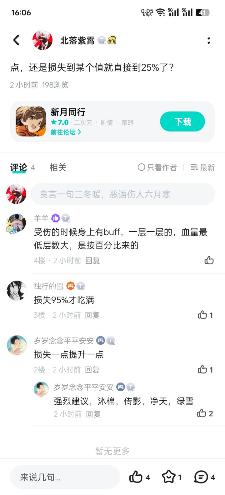 前面发了一篇咨询净天超限技(图一)里根据损失生命值提升暴击率的帖子,有热心的友友回复我了(图二)。同时,我就这一问题咨询了游戏客服,客服的答复是自己探索(图三)。我自己打了下,并没有自身加buff(图四),而且我觉得也不可能加buff,因为只是超限技有这个效果,普攻没有。我在B站上找了些攻略视频,在up主我叫棉被的视频里介绍损失95%血量能吃满(图五)也是up说自己经过大量数据测试,具体测试过程没有。
