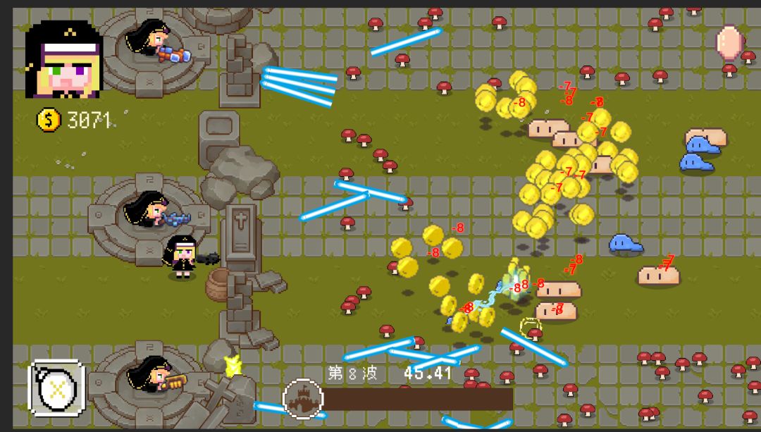 经过最后这几天的爆肝,游戏的主视觉图完成,修女们的军备库得到充盈,增加了激光发射器(何尝不是一种LightMachineGun),星星霰弹枪(Star light也是light)、闪电机枪(Lighting machine。。Gun ?)等等,剩下的就等到大伙儿到游戏内在体验吧! 谁还记得这游戏最初的模样,经过这20多天的开发,咱们这四个社畜史莱姆都非常累,但是看着游戏从最开始的一坨一点点完善,内心还是有些微的成就感的,后续我们会持续完善游戏,策划史莱姆说游戏的数值用脚填的,程序史莱姆写了一坨大史莱姆山,美术。。呃。咱们没有美术,都是程序史莱姆顺手画的哈哈。 各位,拿起信物在史莱姆大潮的进攻下守护小小的教堂吧! #TapTap聚光灯独立游戏 #聚光灯gamejam开发者日志