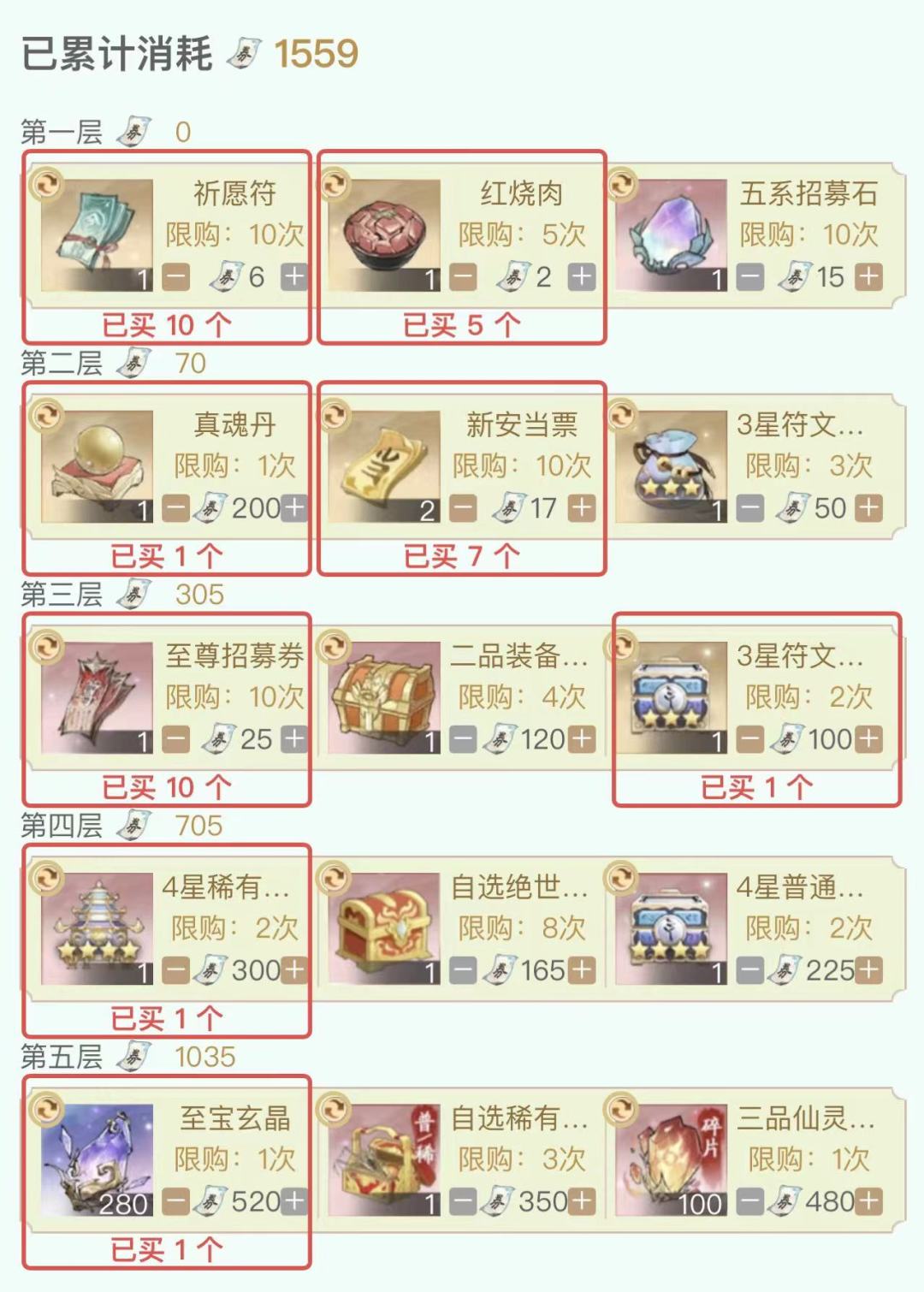 第五层:在没有553以及1120至宝玄晶的库存下,还是建议选择至宝玄晶(大佬可无视),白票多的话也可以选择一下S3石头,但是会放慢下一轮姑苏的进度