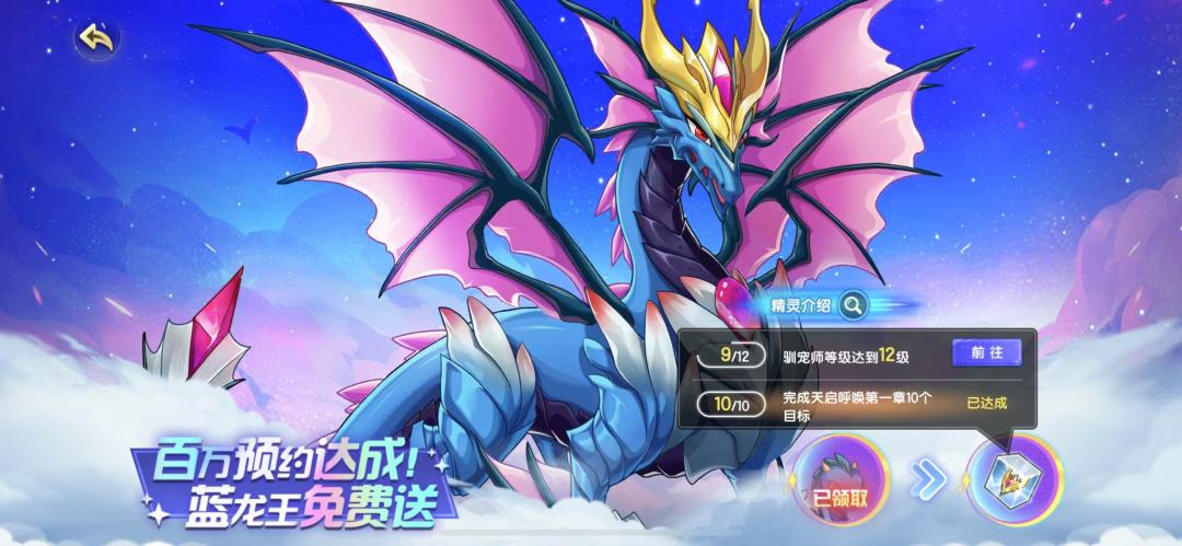 目前进游戏可以直接领取蓝小龙,后期可以进化成-蓝龙王-,是个非常强大的精灵。
