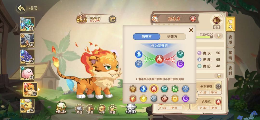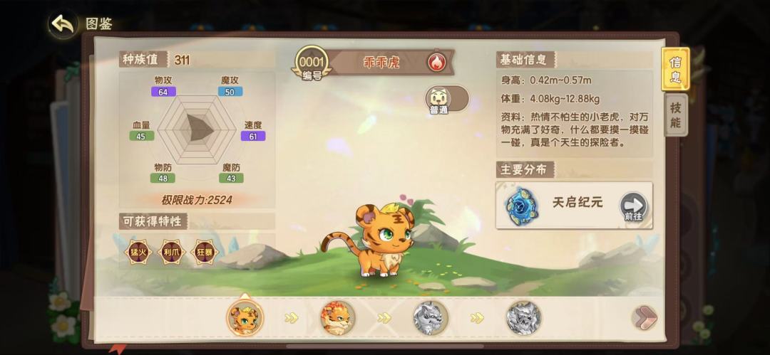 开局建议选火系乖乖虎,它的综合输出伤害高,在前期推图能力较强。和宝可梦的设定差不多,火系开局会比较强。