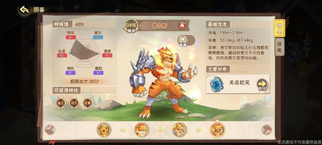 获取方式:我们开局选老虎, 费尔斯是燃烧虎的超进化形态,是天启纪元第一只开启超进化的精灵。玩家需要挑战费尔斯,战胜它之后可以获得火魂印超进化燃烧虎。