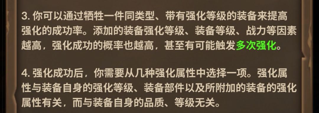 1、强化技巧。大家请仔细阅读理解强化说明。举例子,无强化的衣服吃+10的保底爆伤衣服,强化会一次到6-7级,本次强化属性只会从垫子装备的强化属性中选择。总结:①+15纯强化属性就是如此得来②触发多次强化,加一次水,淬炼概率巨高,人人附魔都是满值③妈妈再也不用担心强化歪属性了④垫子装备主要靠极品绝对值影响强化成功率