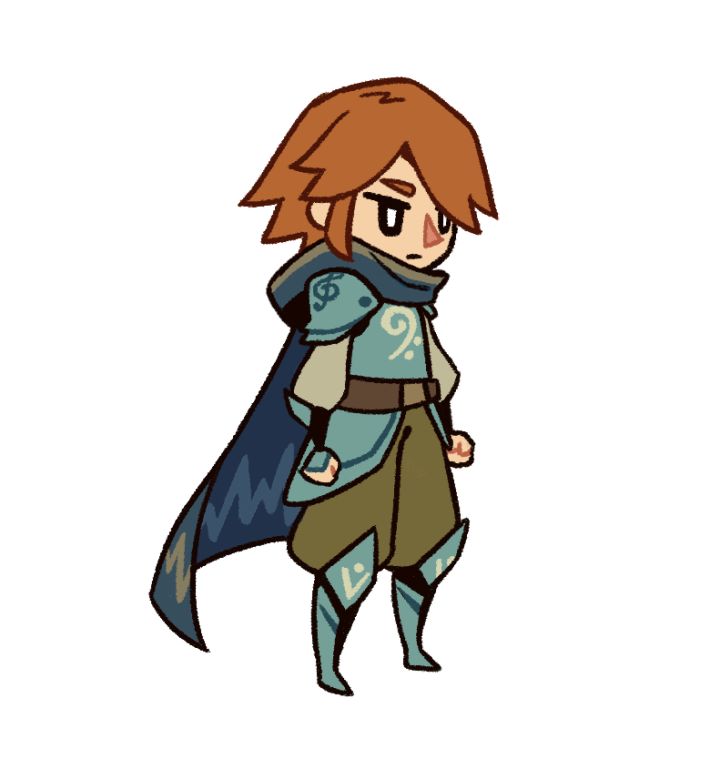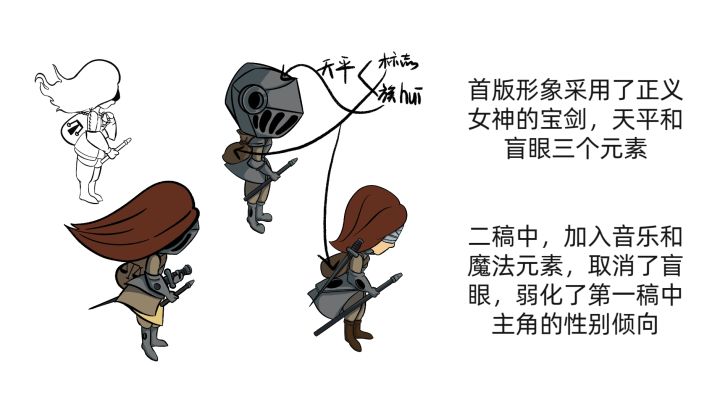 为了契合主角能够通过音乐节奏进行攻击,新的设计延用了初稿(由“龙”绘制)里的五线谱符号,并以“节奏”为灵感在披风上添加了音频波浪线条的设计强化角色特点。