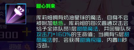 库莉姆虽然小技能有负面效果,但奥义弄到5桭后就没有影响了,被动加攻可以用在高难度pve【新手回归没奶妈可抽】在pvp几乎微乎其微,超频后增强奥义给全体敌人施加减能和沉默。但奥义启动速度实在是慢的一批,而且如果不带保命魂器是真的容易暴毙,只能当对策卡来用了