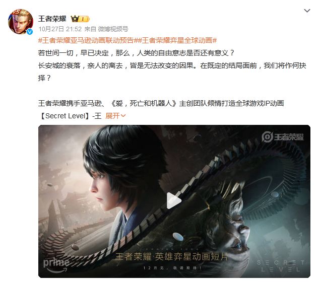 官方表示,将联合亚马逊、《爱,死亡和机器人》主创团队共同打造全球游戏IP动画【Secret Level】-王者荣耀·弈星。
