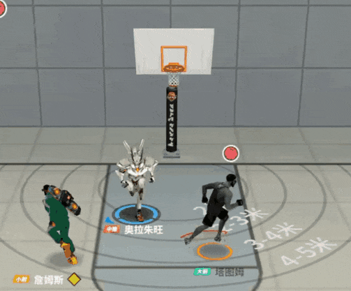 对面2个内线,一个在篮下,一个正在向篮下狂奔,其他内线球员最优解是先抢占篮下无敌位(篮筐正下方),先保证自己不被卡位,再寻求抢板机会,缺点是会被对面2个人一左一右夹住,极高概率出现抢板受阻。