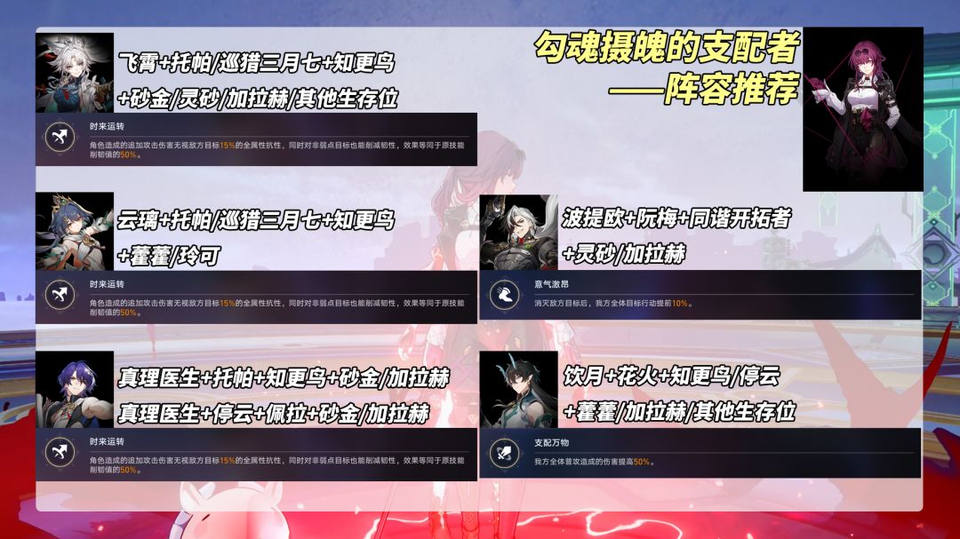 BUFF3,飞霄+托帕/巡猎三月七+知更鸟+砂金/灵砂/加拉赫/其他生存位。