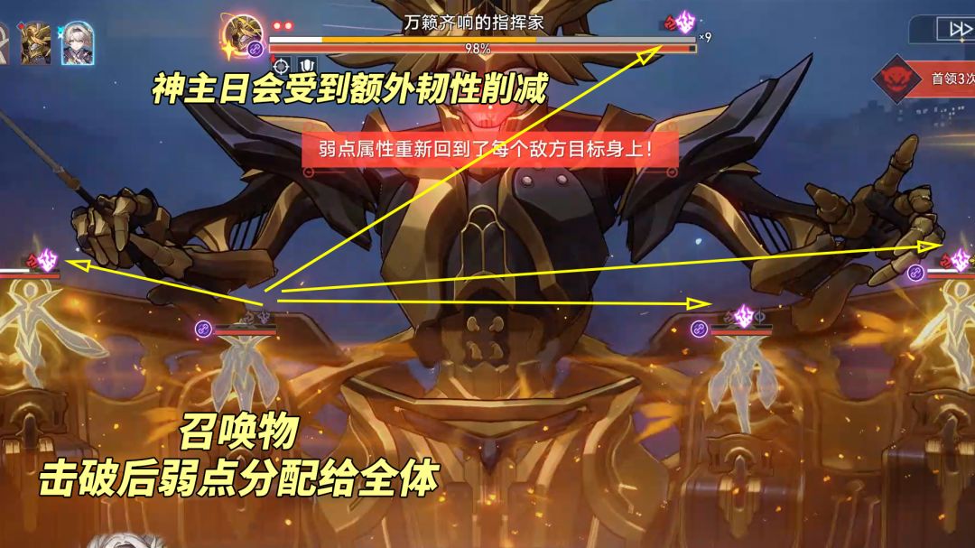 敌人属性弱点「火、雷、量子、虚数」,神主日会按从左到右顺序给4个召唤物分别分配1个属性弱点,任意召唤物被击破时都会将弱点共享给全体敌人,并额外削减神主日韧性值。